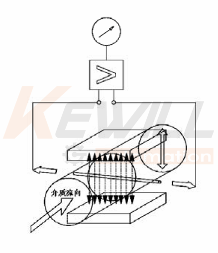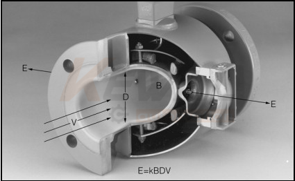 測量流量時,導電性液體以速度V流過垂直于流量方向的磁場,導電性液體的流動感應出一個與平均流速成正比的電壓,其感應電壓信號通過二個或二個以上與液體直接接觸的感應電極檢出,并通過電纜送至轉換器通過其智能化處理,實現(xiàn)流體瞬時流量、積累流量的顯示及流量數(shù)據(jù)與控制系統(tǒng)之間的通訊。測量管內無活動及阻流部件,因此幾乎沒有壓力損失,并且有很高的可靠性。
